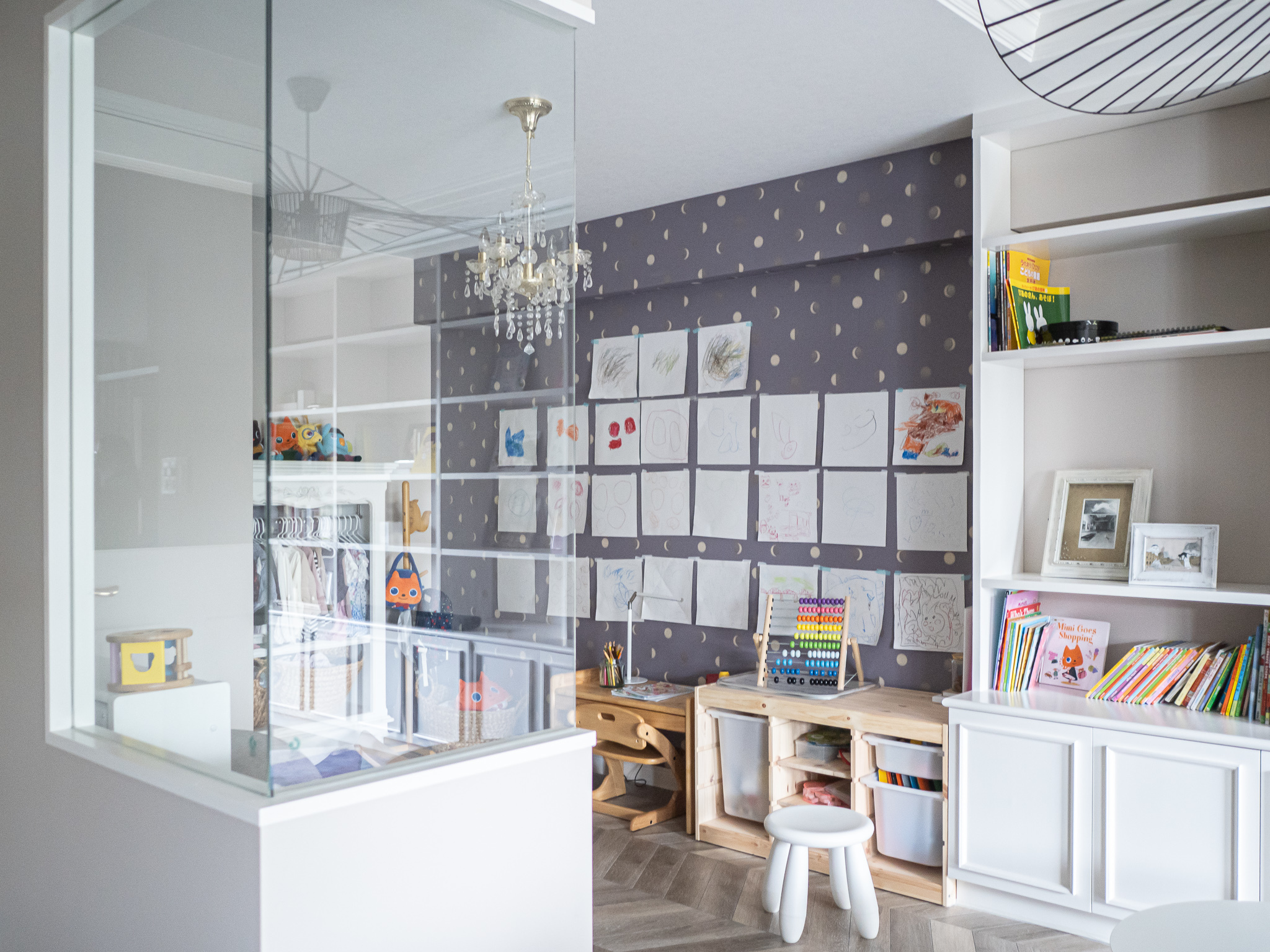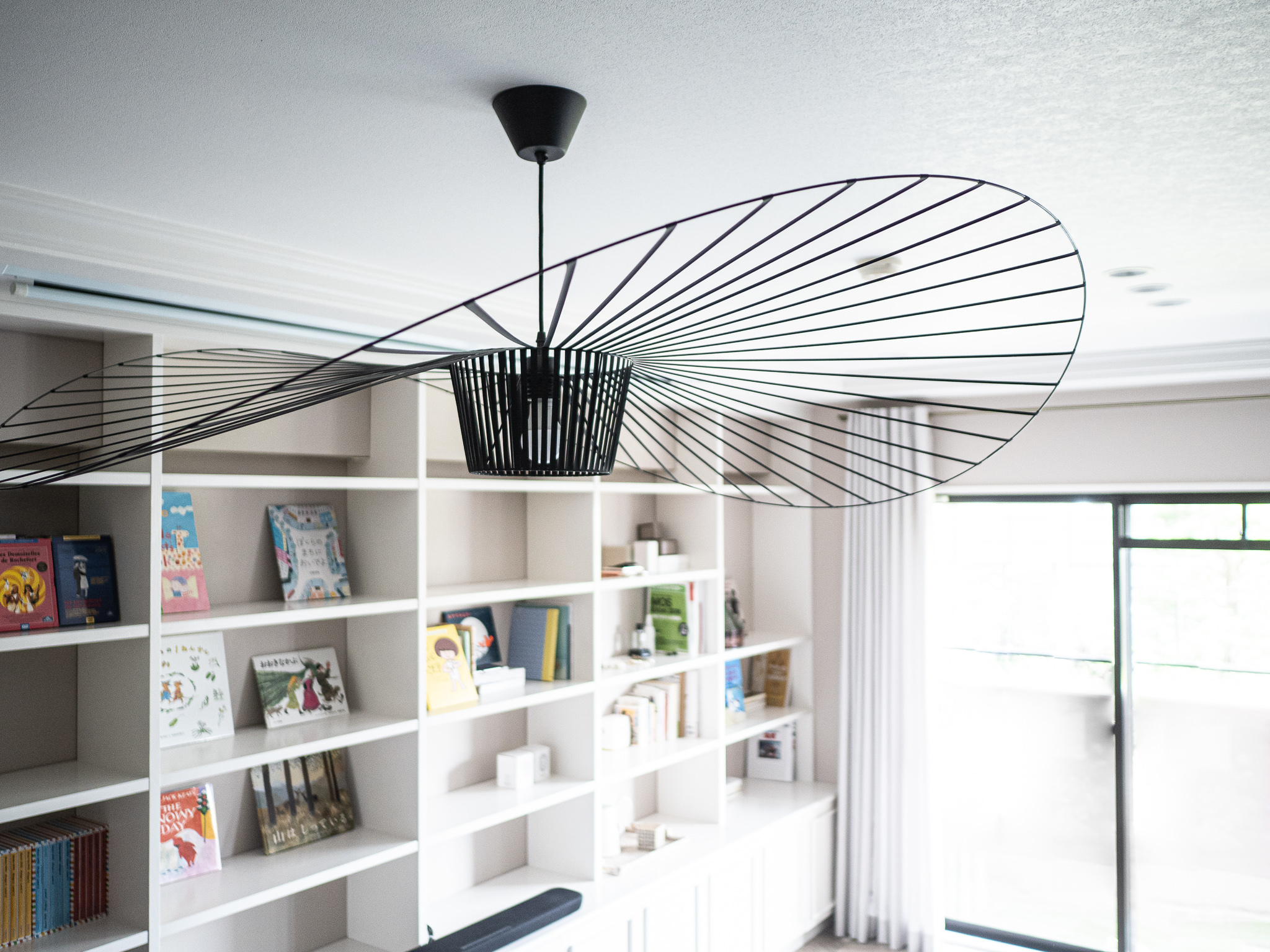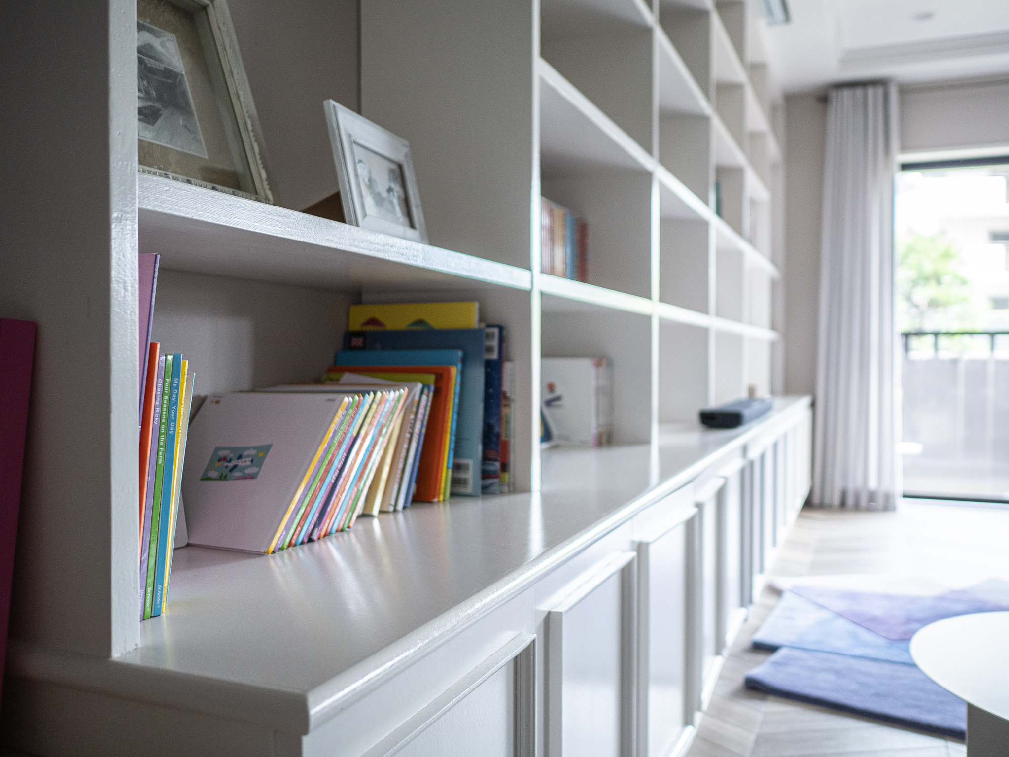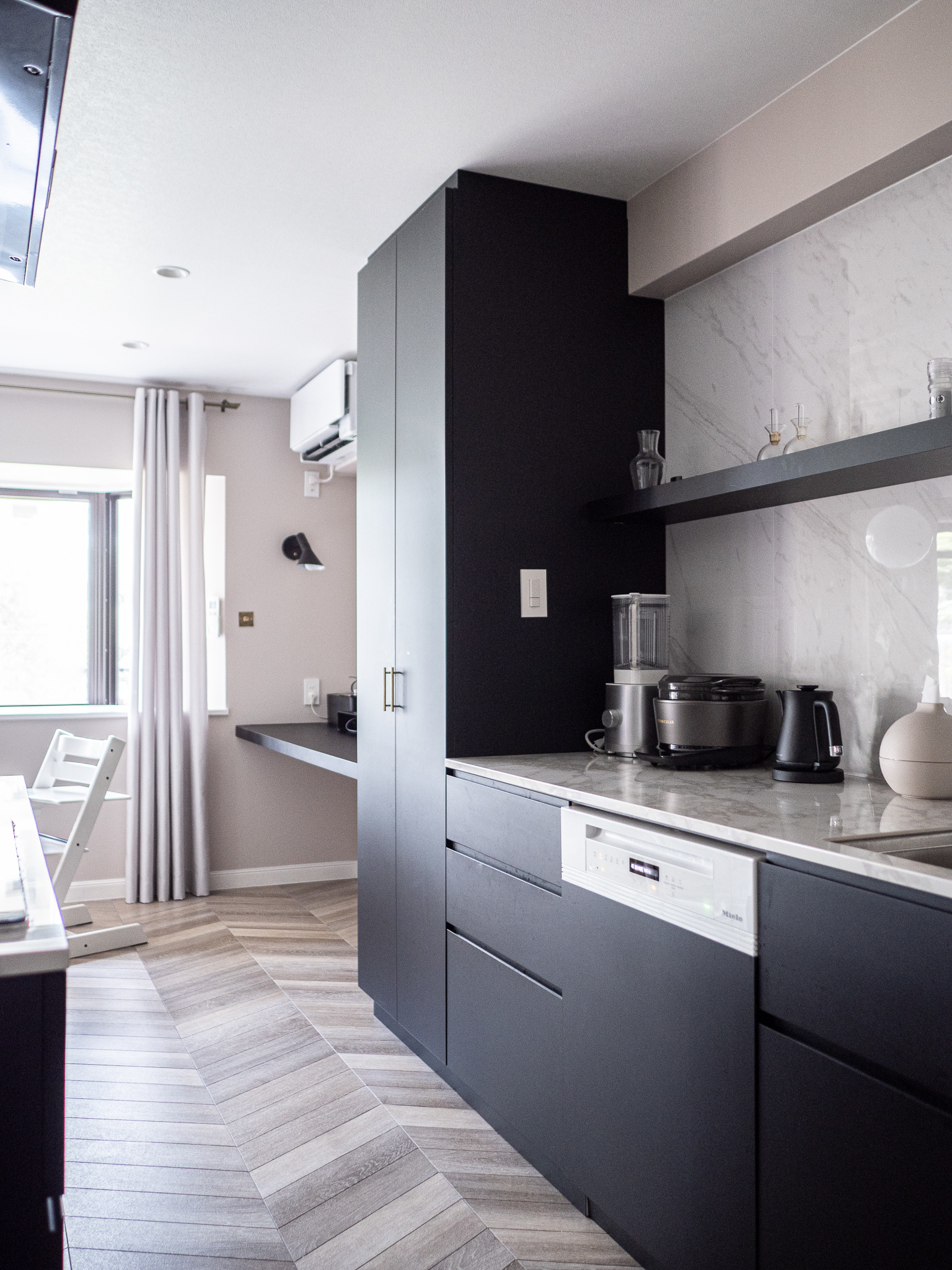 パントリーを設けたりデスクや本棚も造作することですきっりとしたホテルのような空間に。