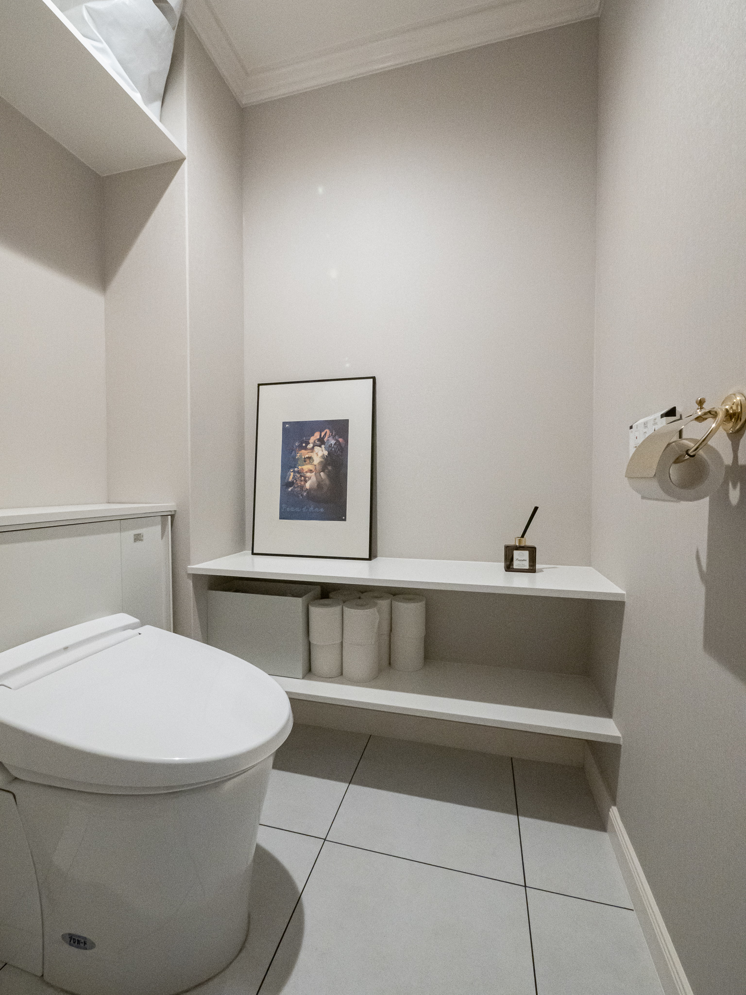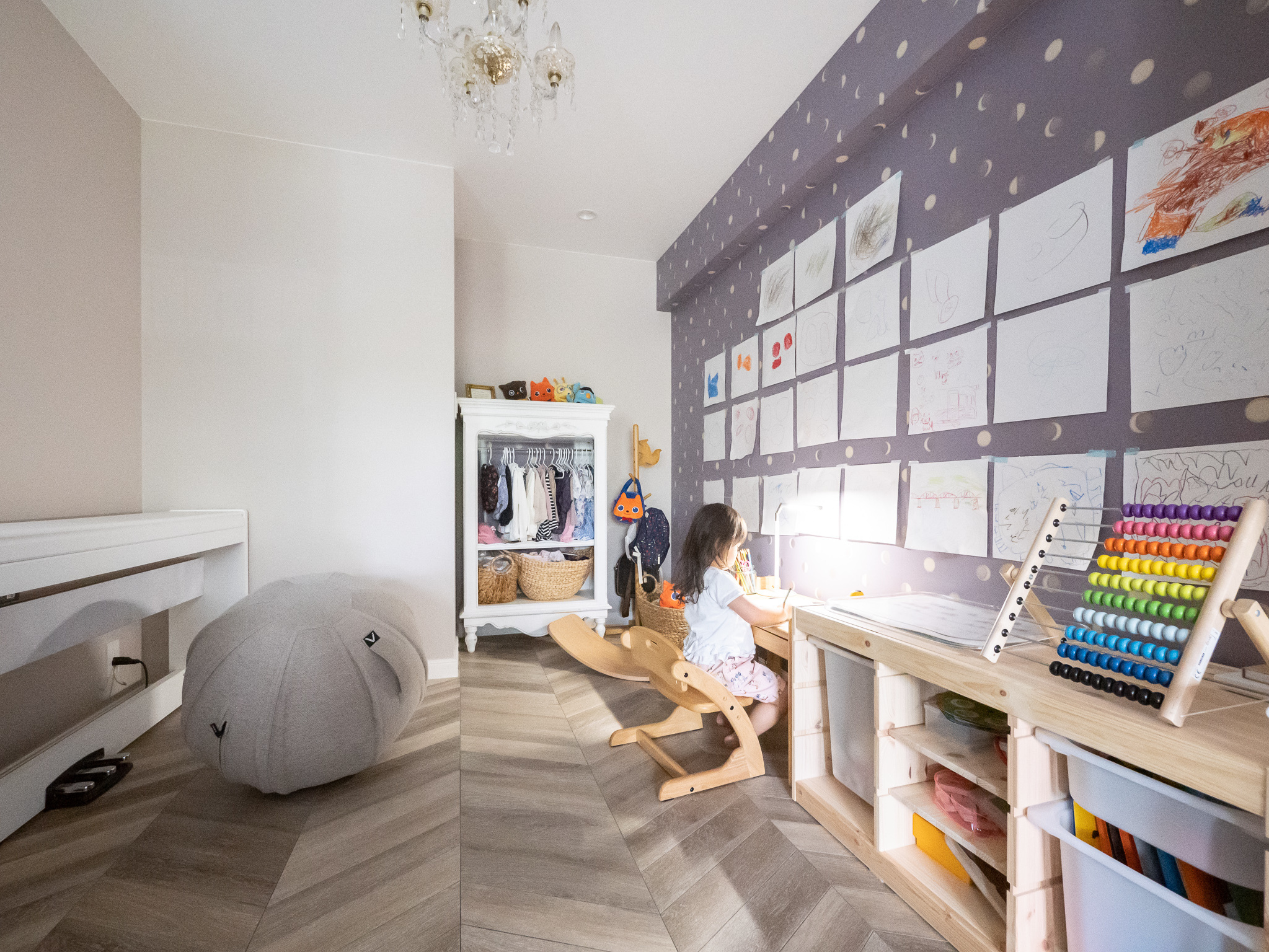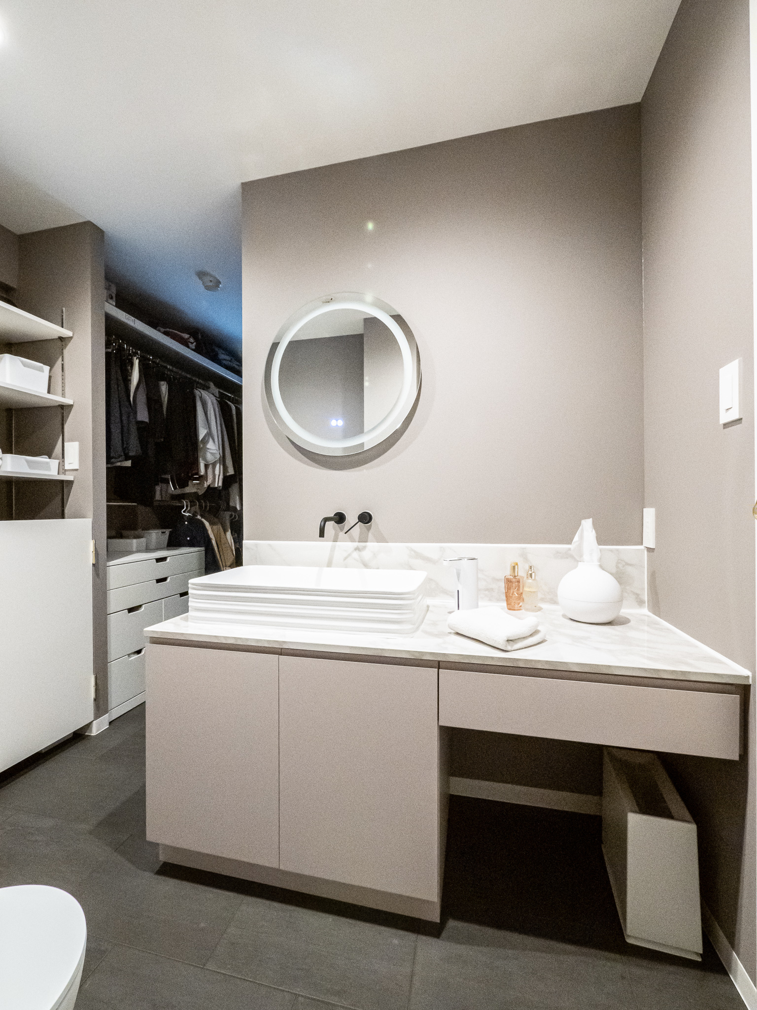 パントリーを設けたりデスクや本棚も造作することですきっりとしたホテルのような空間に。