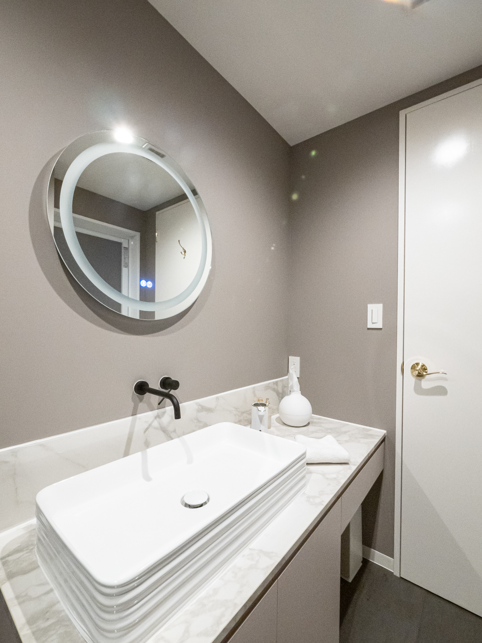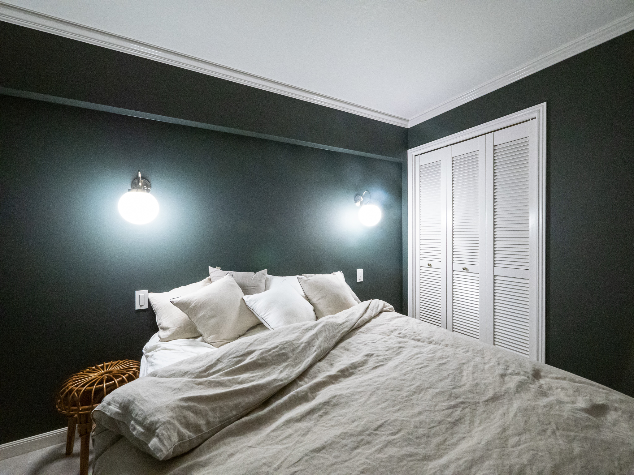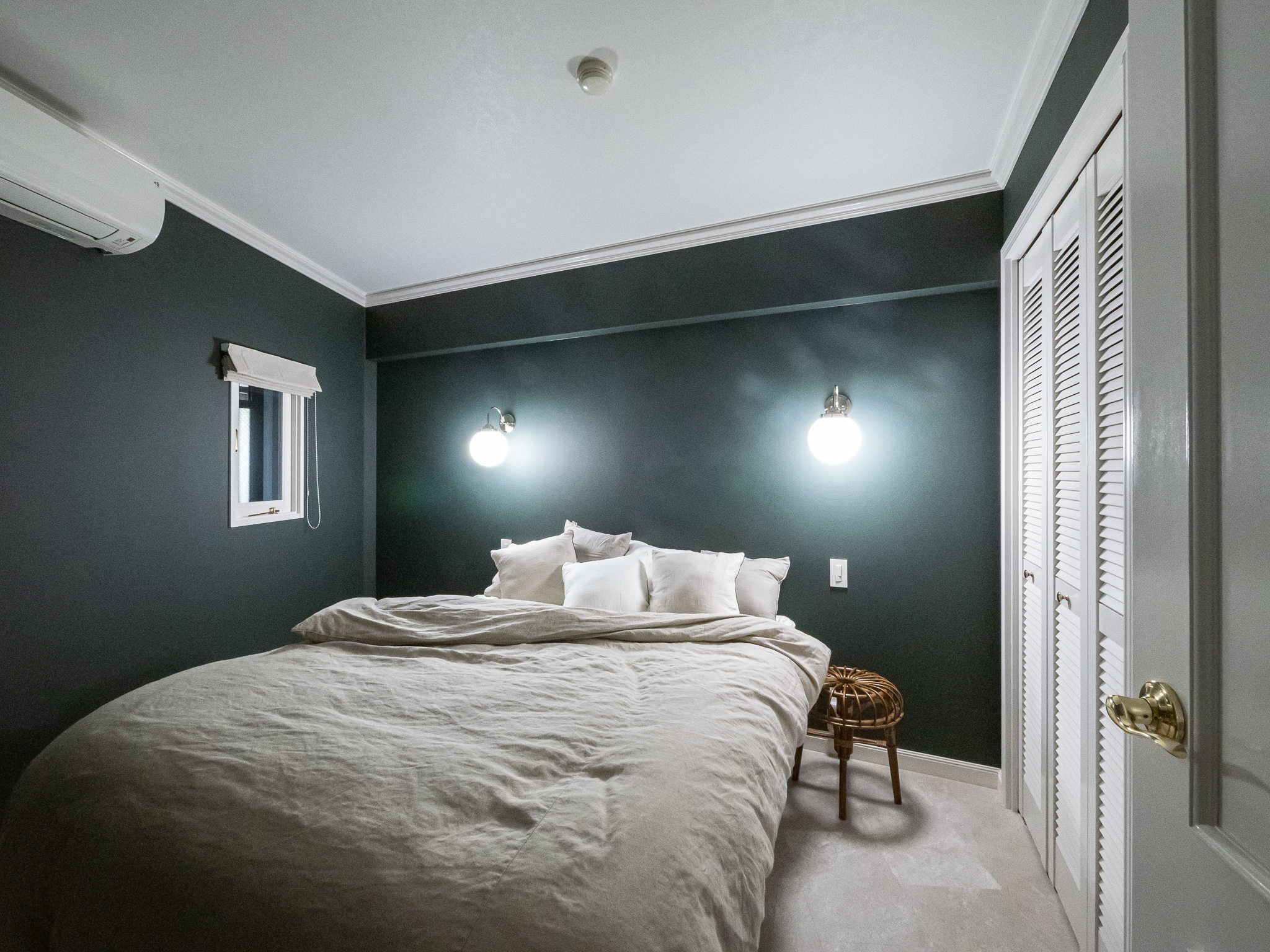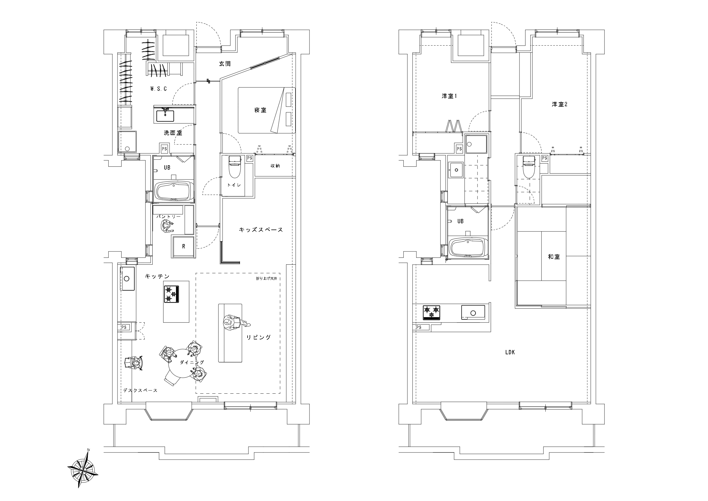 パントリーを設けたりデスクや本棚も造作することですきっりとしたホテルのような空間に。