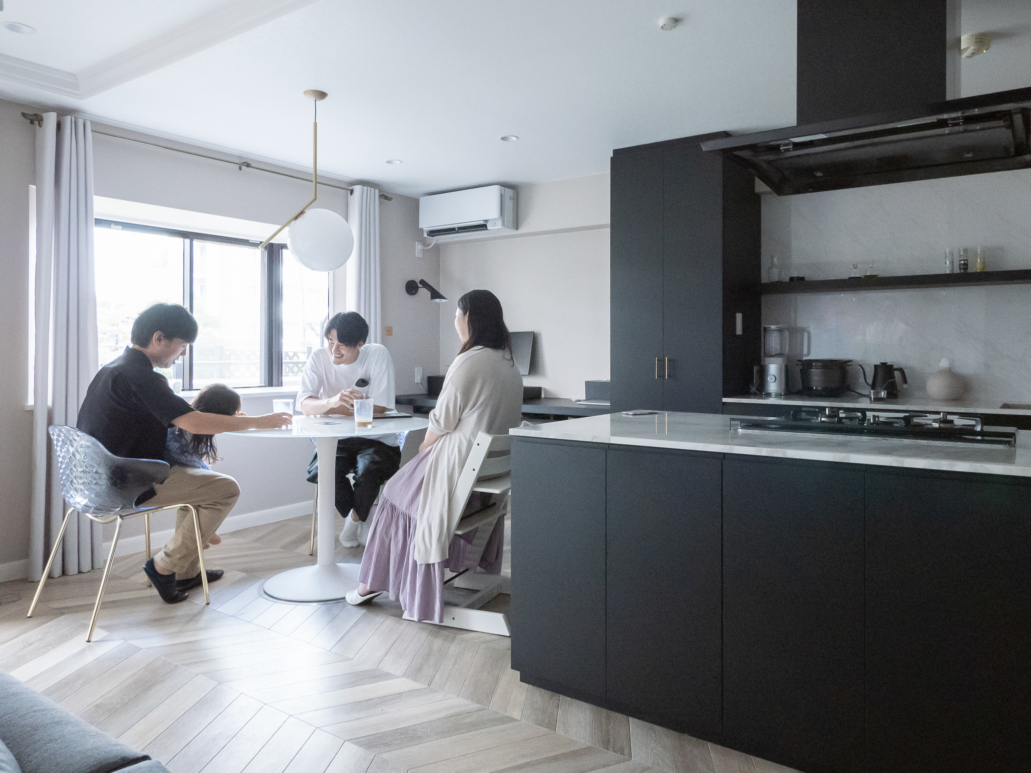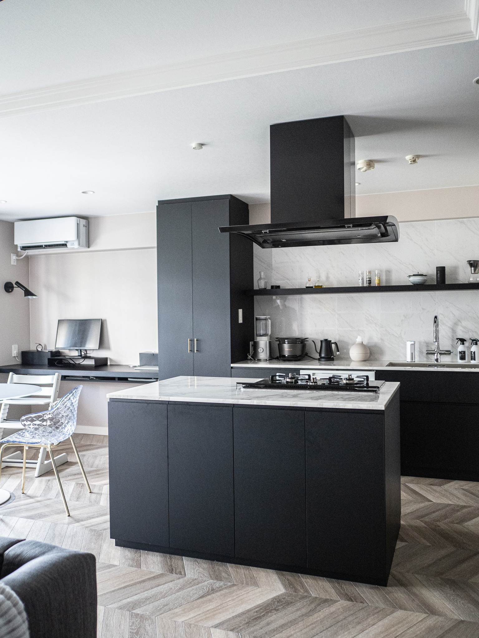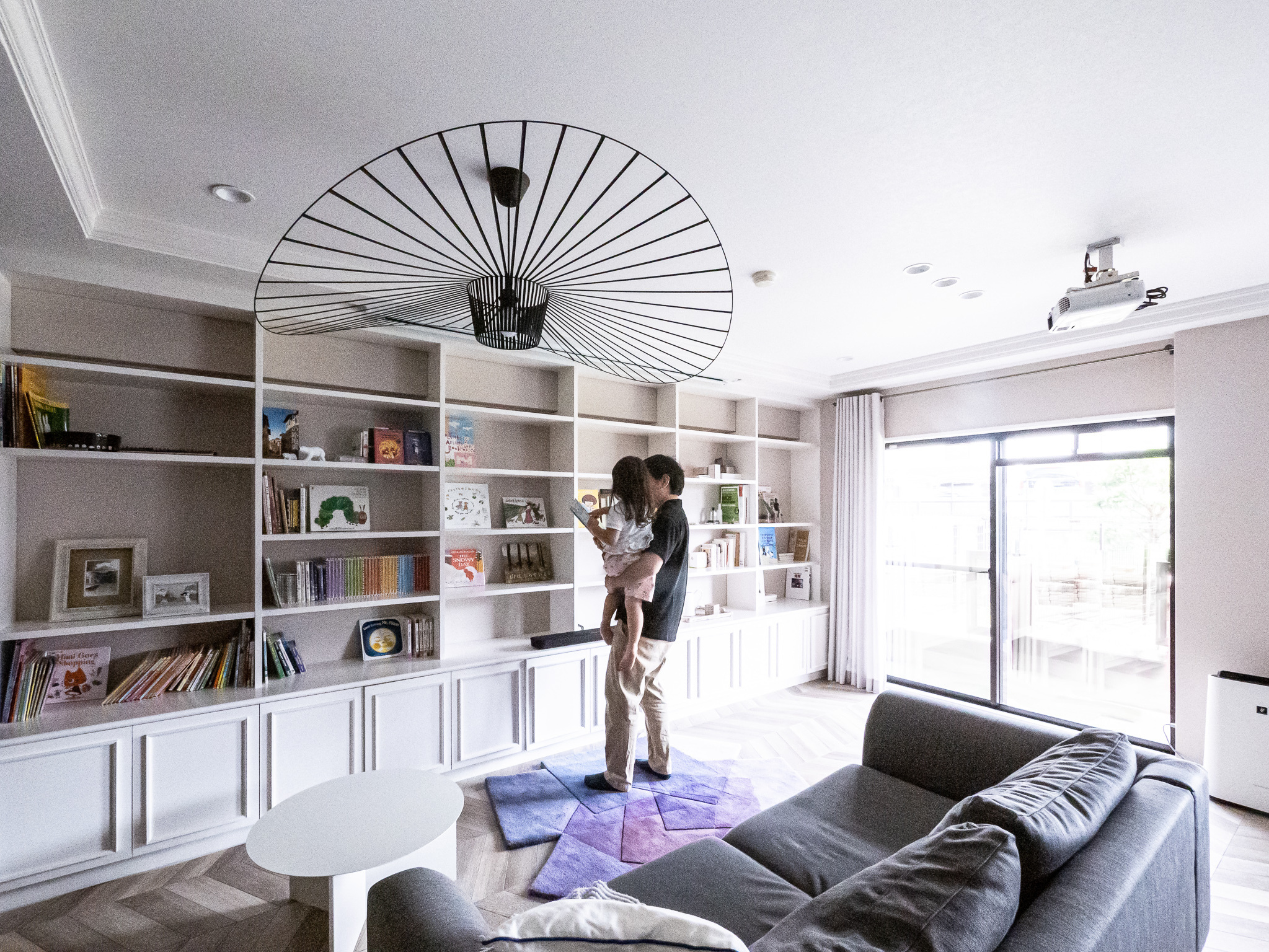 リビングは装飾の量を減らし、造作キッチンもミニマルなデザインにすることでクラシックさはありつつ、モダンな家具が照明が映えるように。