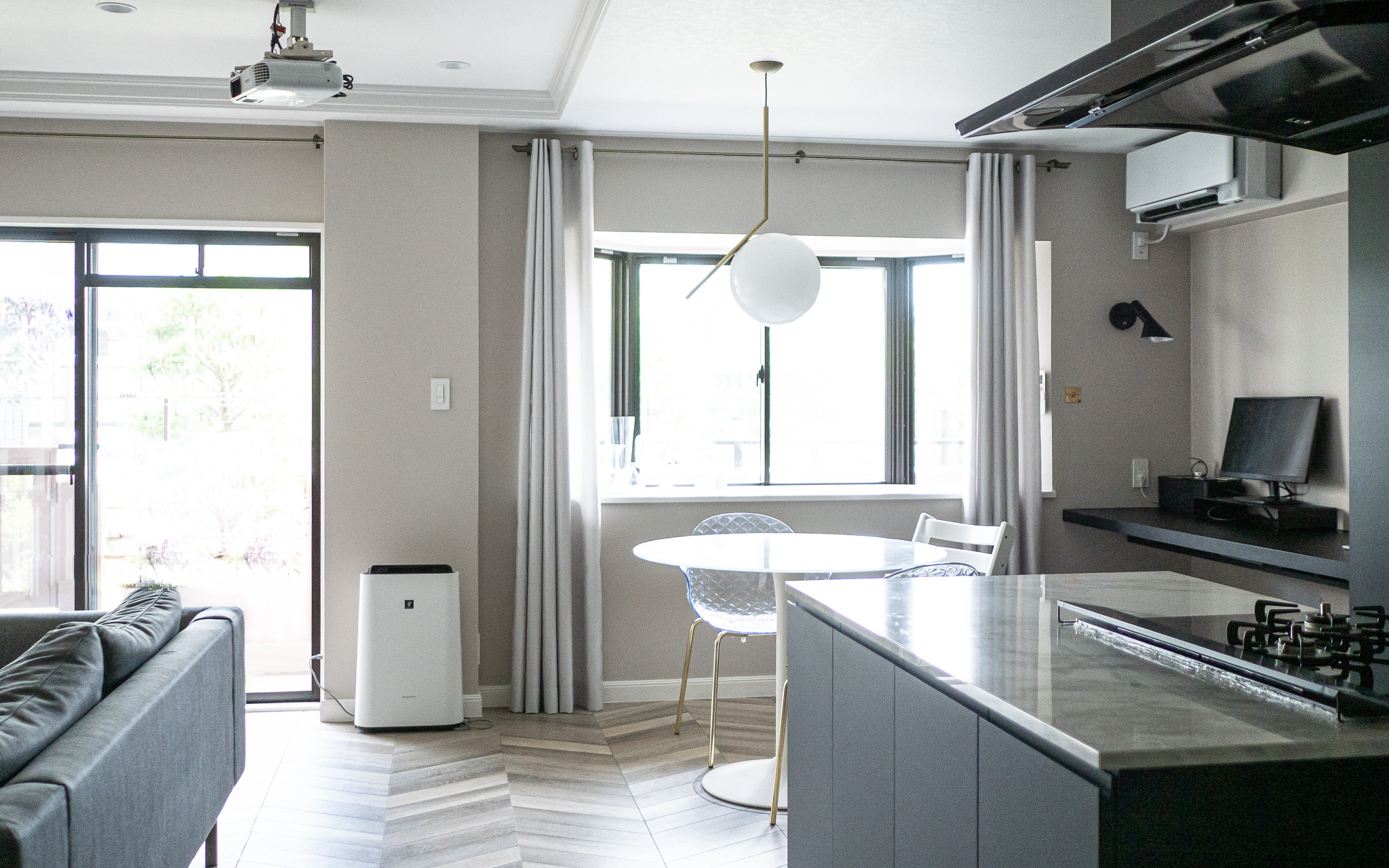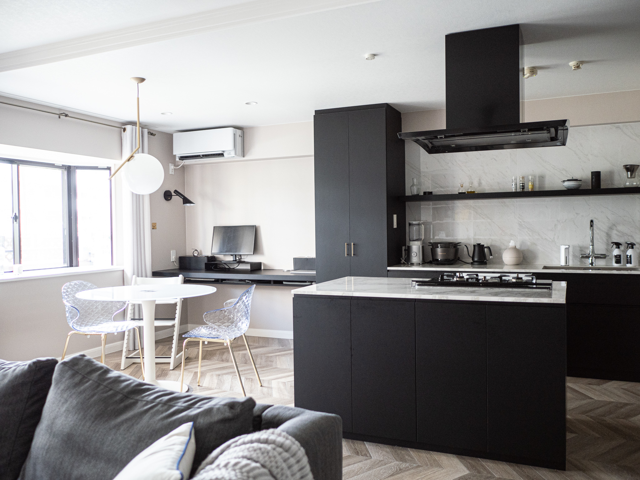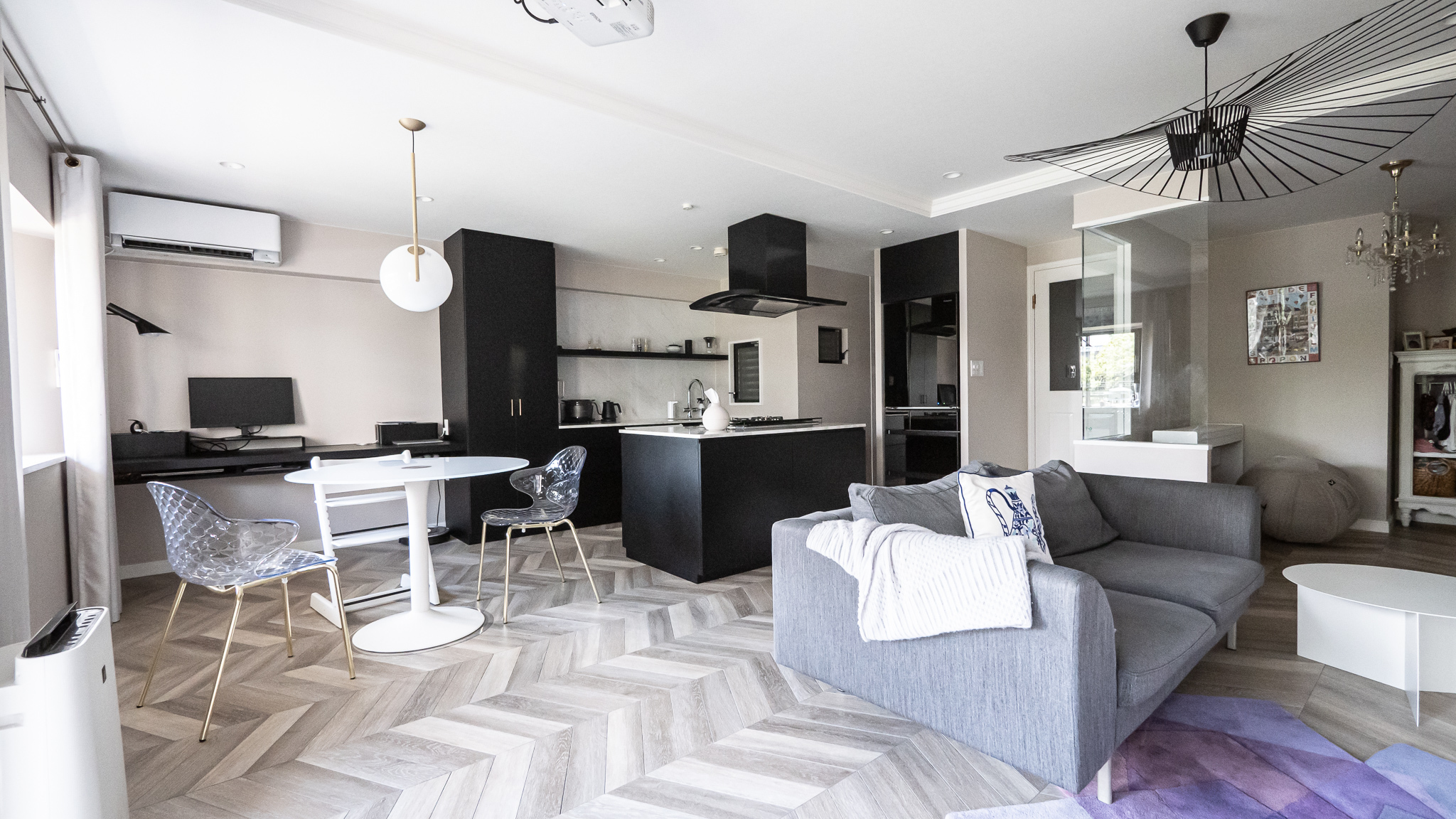 リビングは装飾の量を減らし、造作キッチンもミニマルなデザインにすることでクラシックさはありつつ、モダンな家具が照明が映えるように。