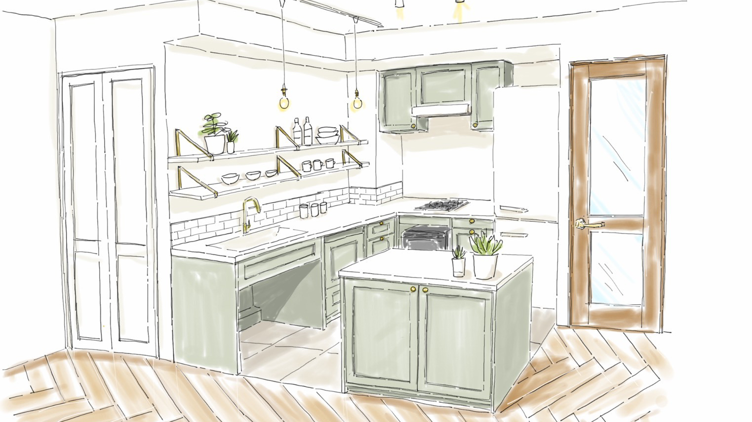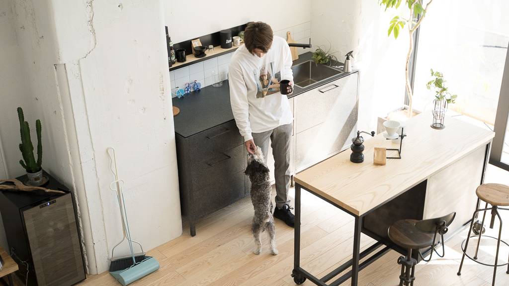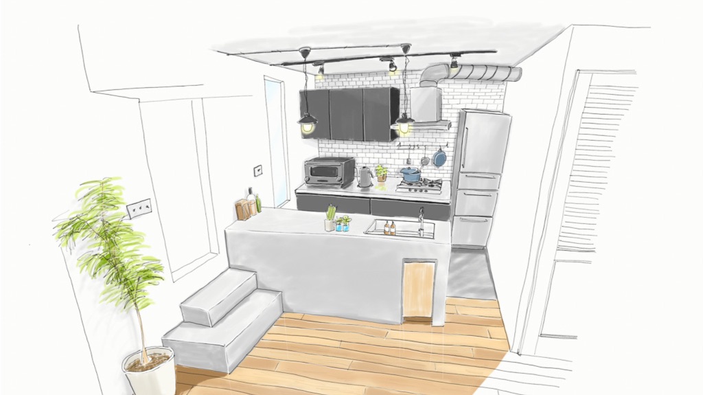 上記日時以外でご希望の方はご相談下さい。 作業台付きのオリジナルキッチン、ヘリンボーンの床。