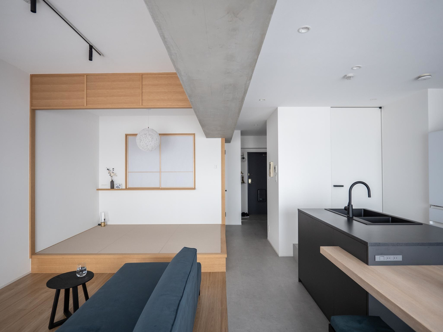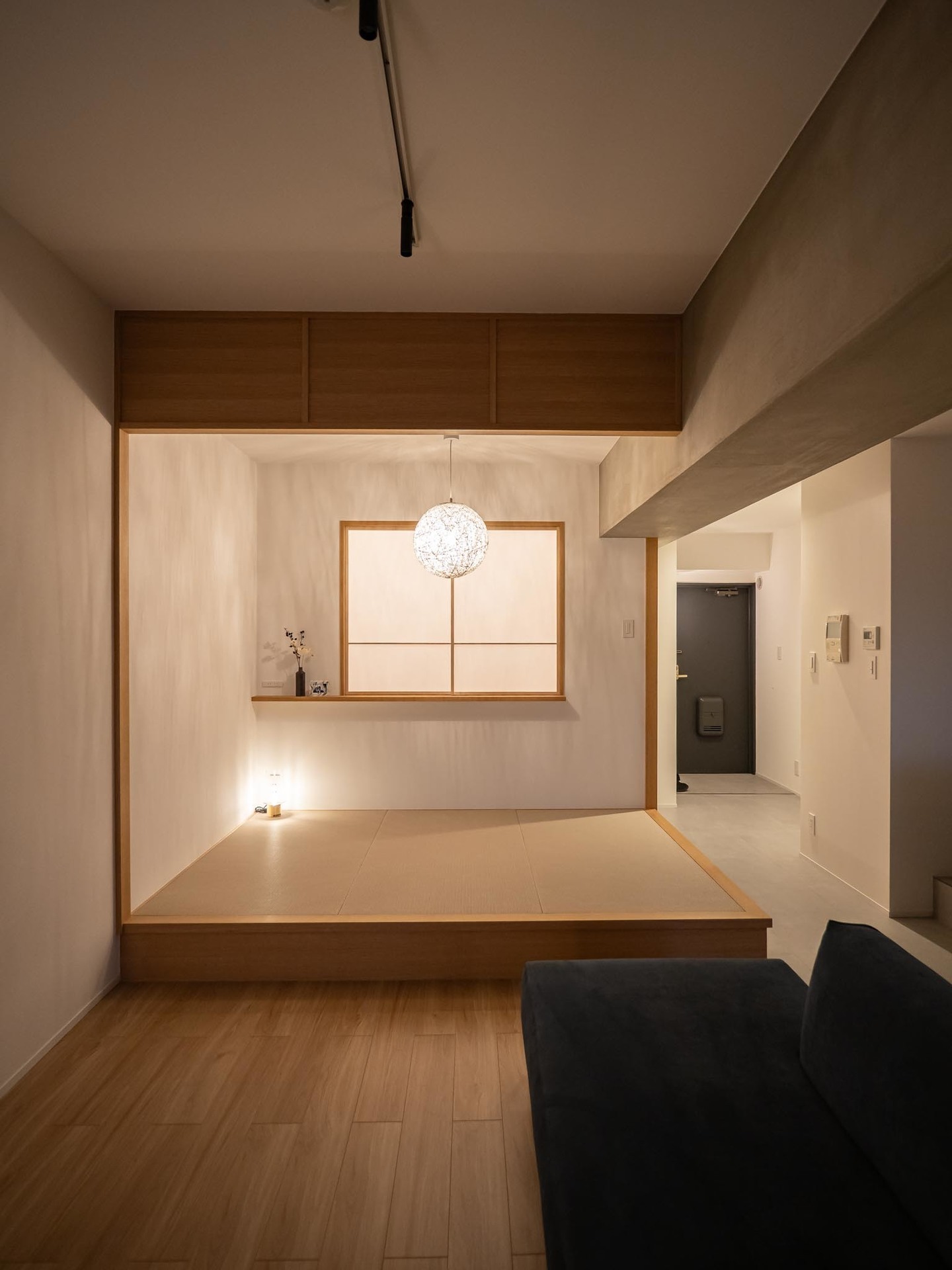 シンプルモダンの中にも和の要素も入れたいということで、小さな小上がり畳スペースも確保。