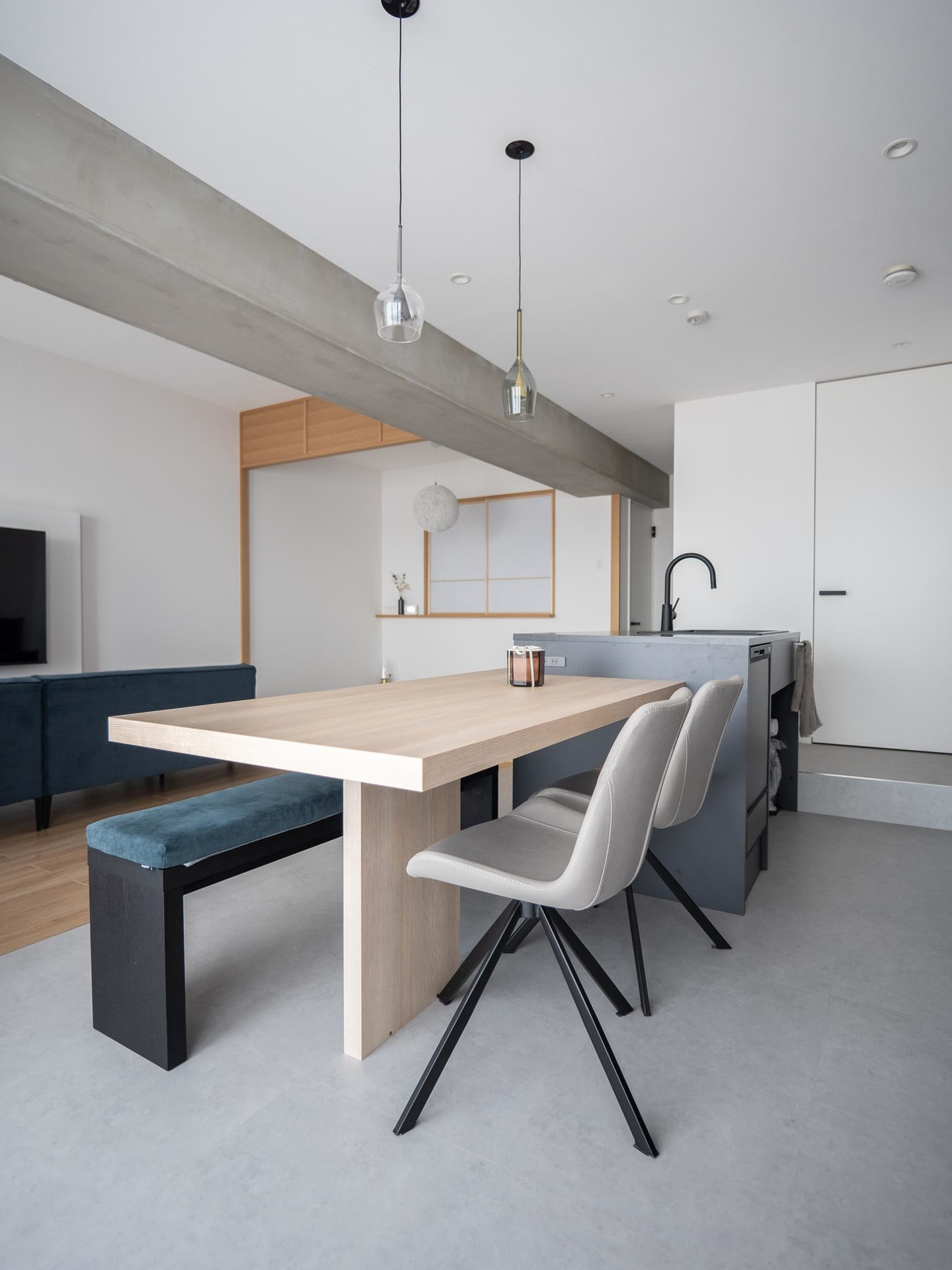 構造上取れない梁はモルタル塗りでアクセントに。