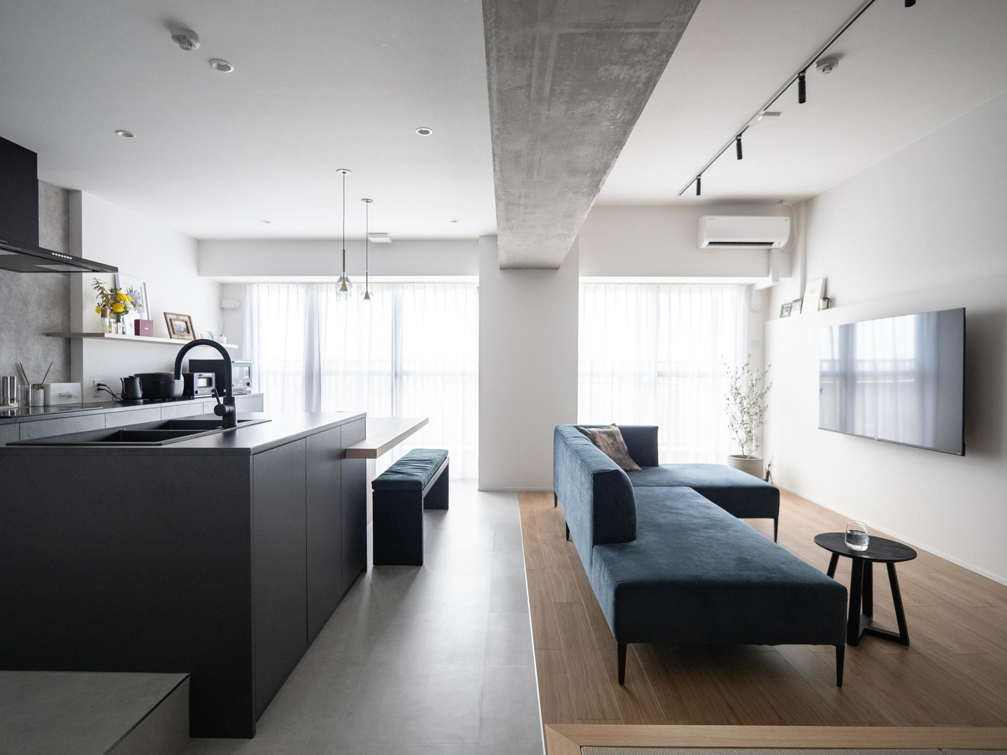 限られた面積を最大限生かすためリビングドアはあえて設けず廊下ほぼゼロに。コンパクトなのに広がりを感じる住まい。
