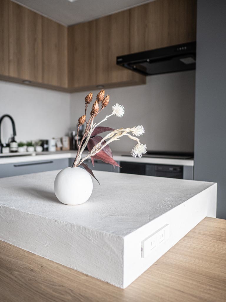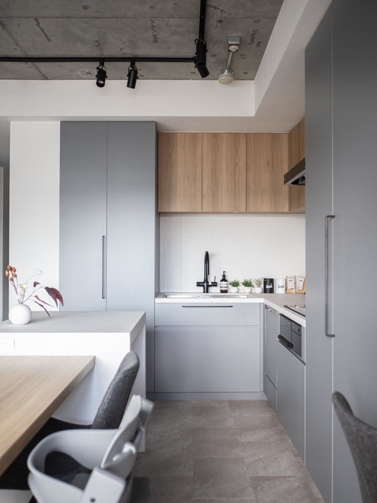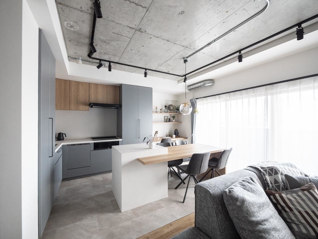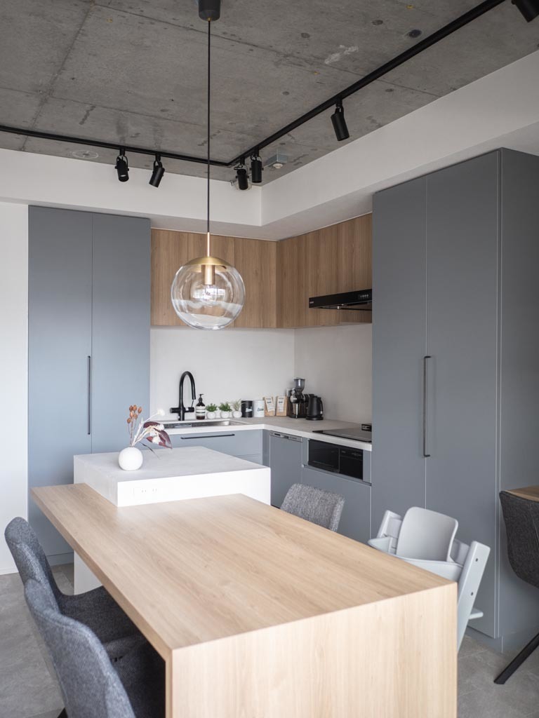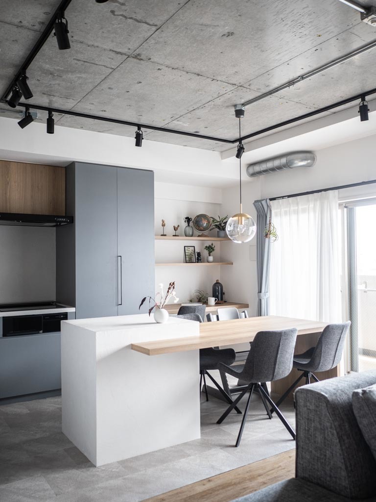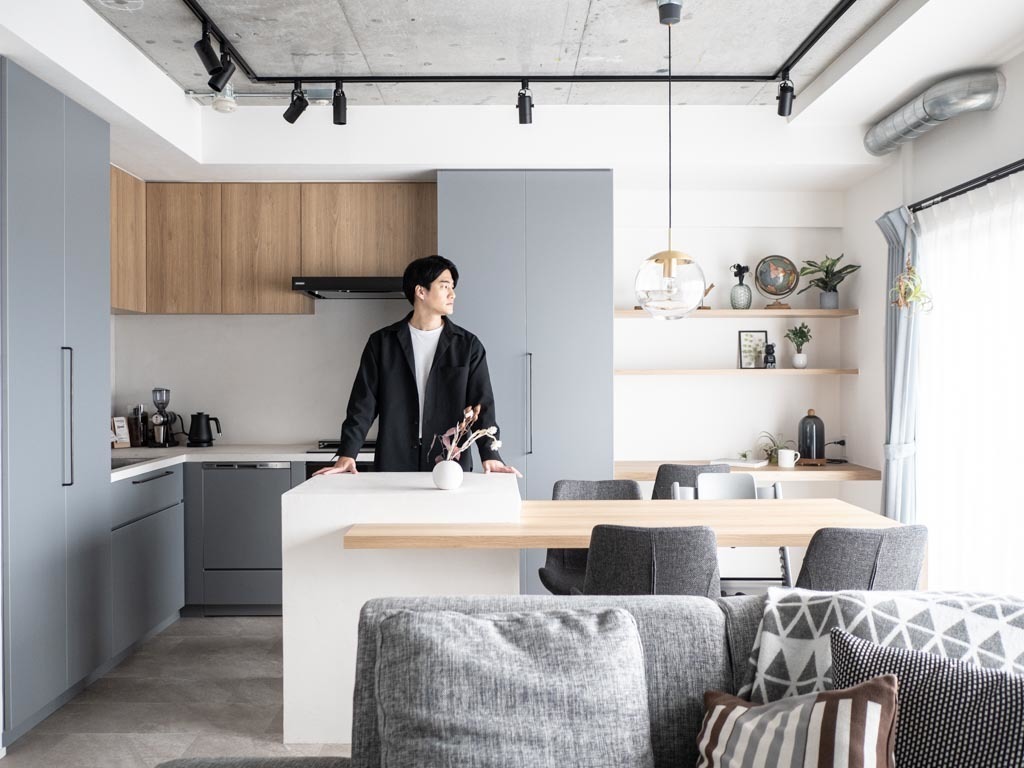 キッチandダイニングはコンパクトながらもフルオーダーで造作することで収納や作業動線はもちろん、デザインも妥協なし。 リビングに造作した4.2mの収納家具は高さを45cmに抑えることで空間を圧迫することなく収納スペースを確保し、ベンチにもなる。