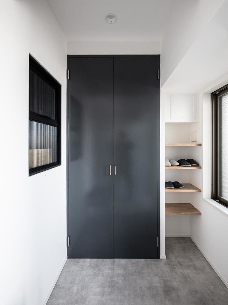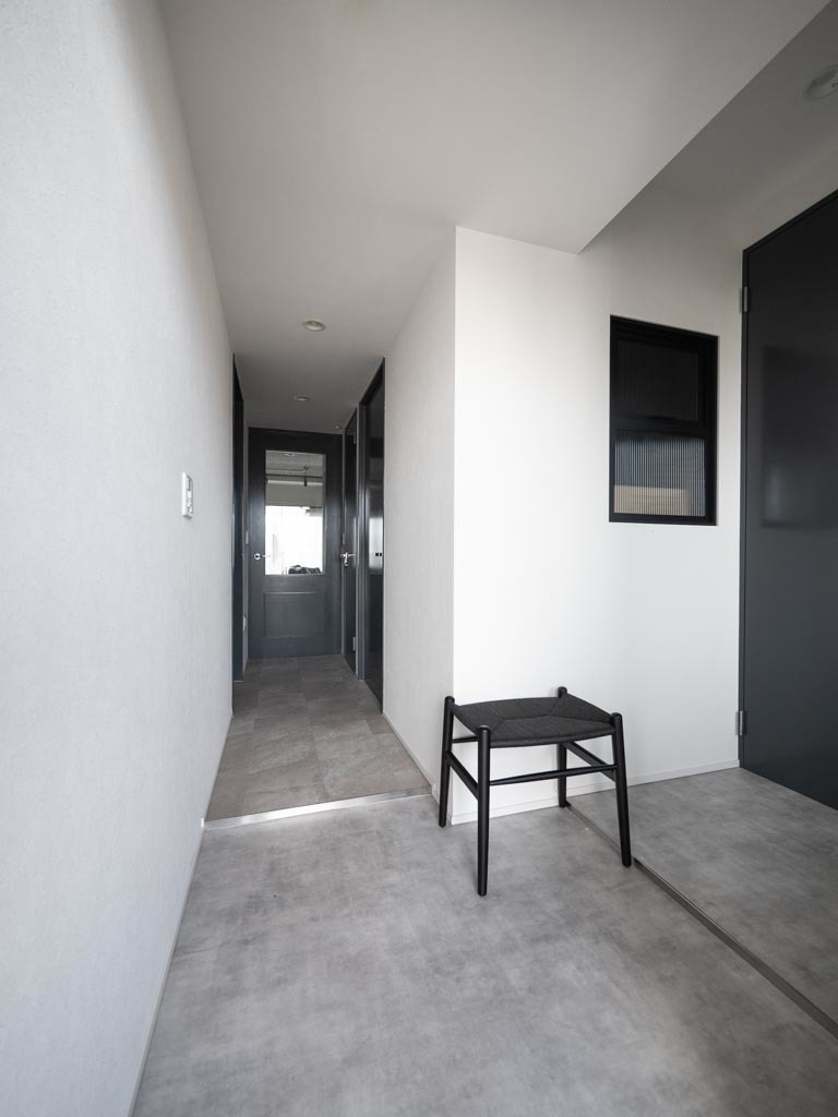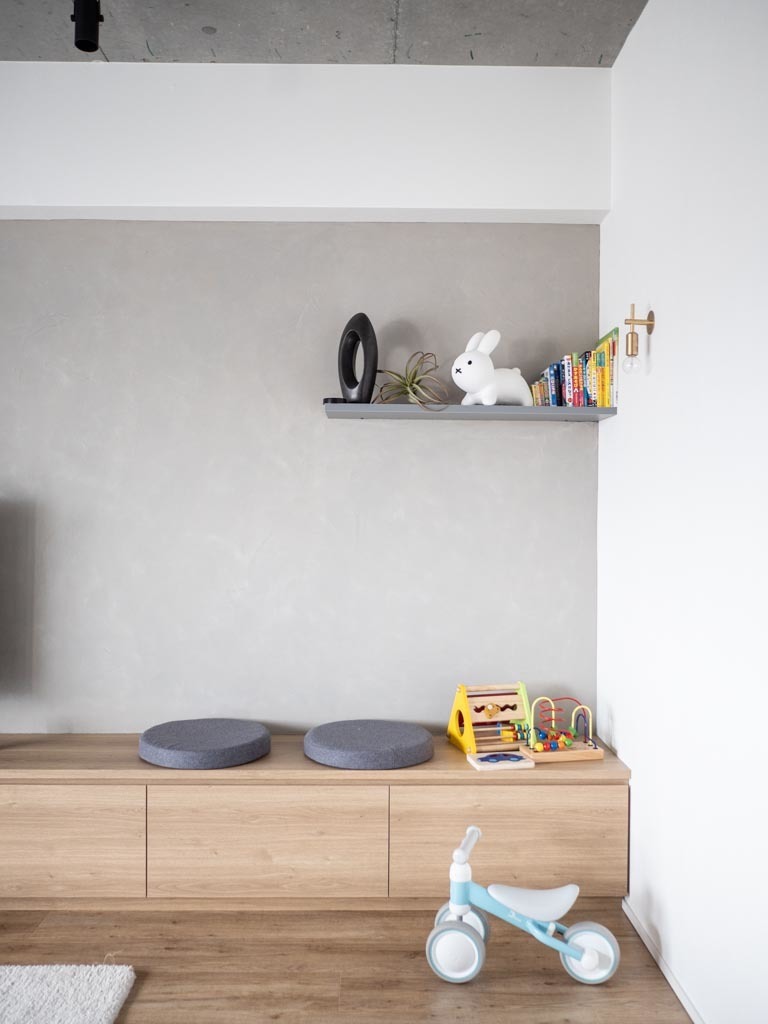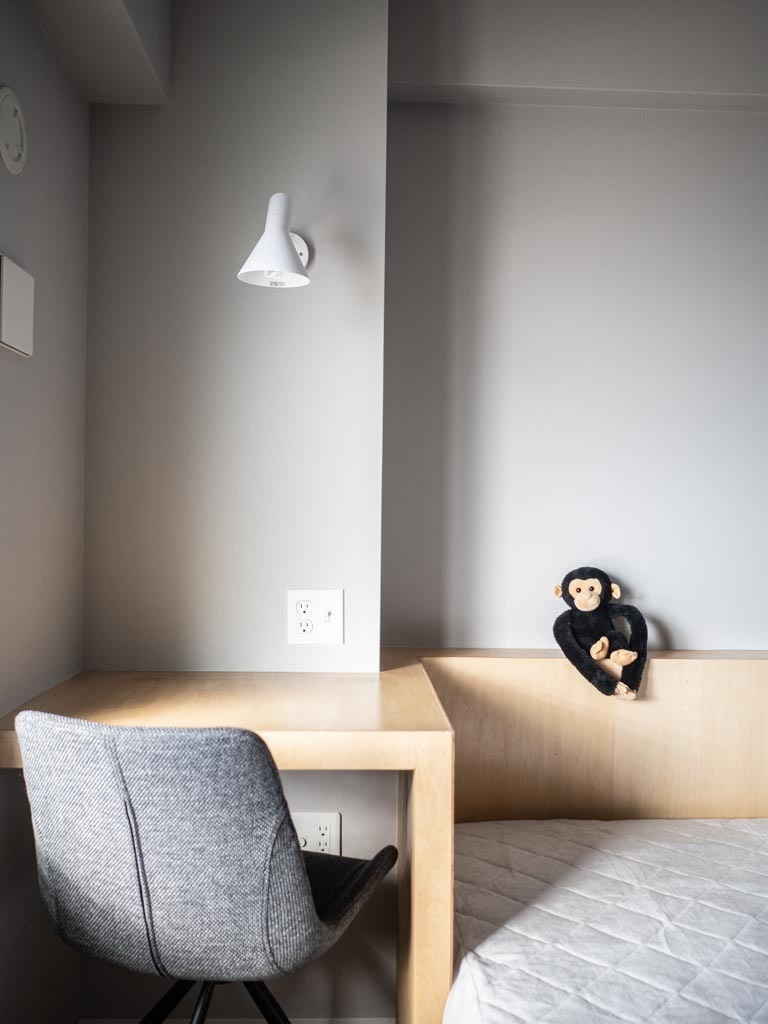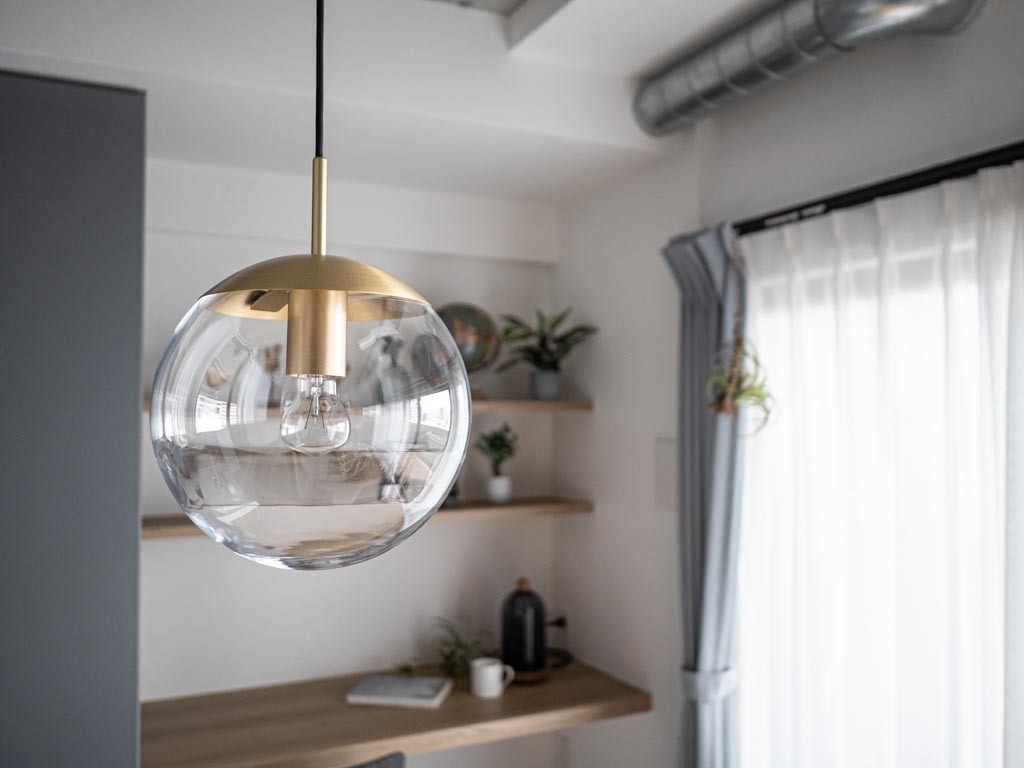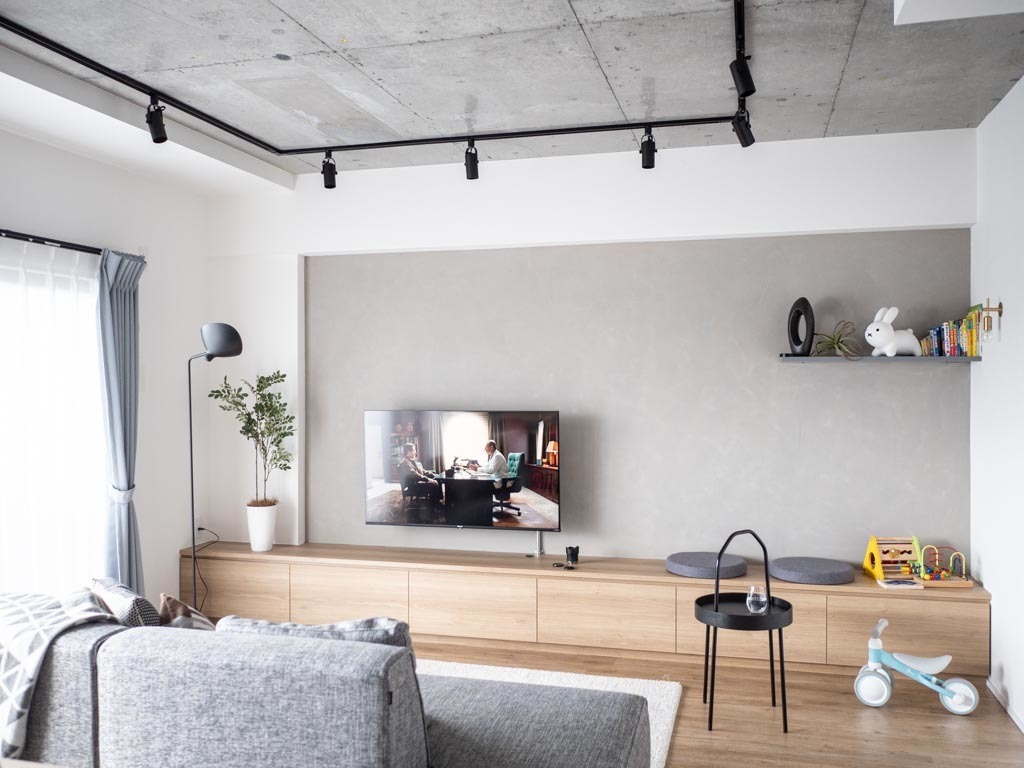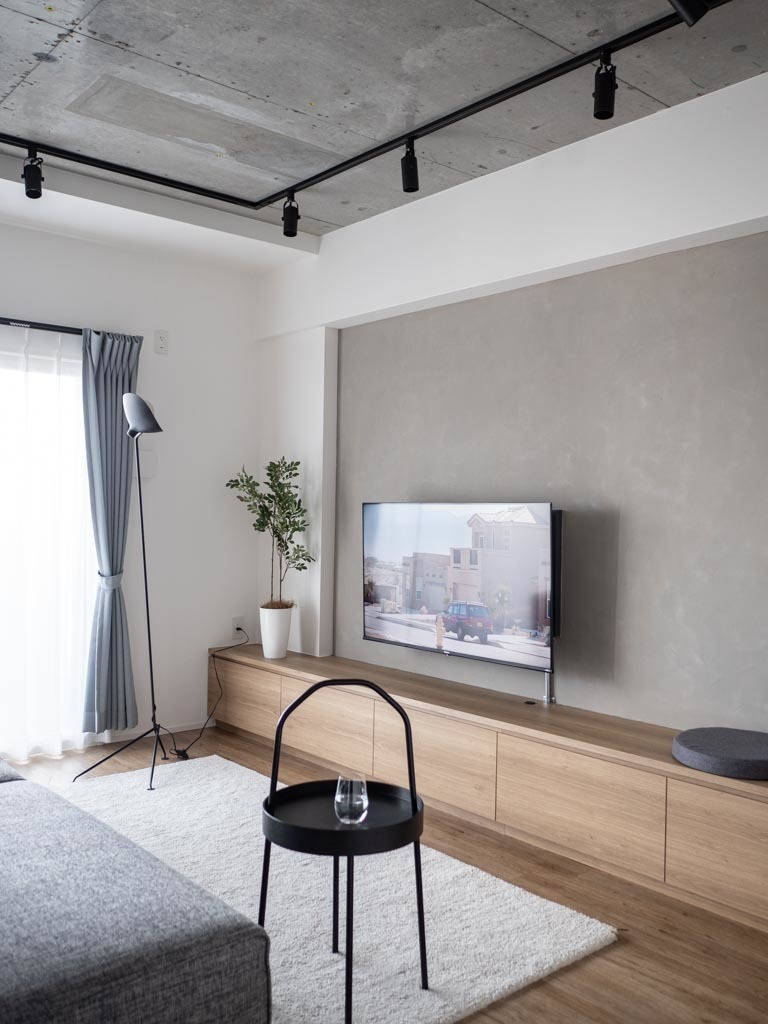天井にむき出しにされたコンクリートや鉄管配管、TV面のモルタル壁などの素材感や武骨さを少し足すことで全体的に「きれいすぎない。」ようにデザインした。